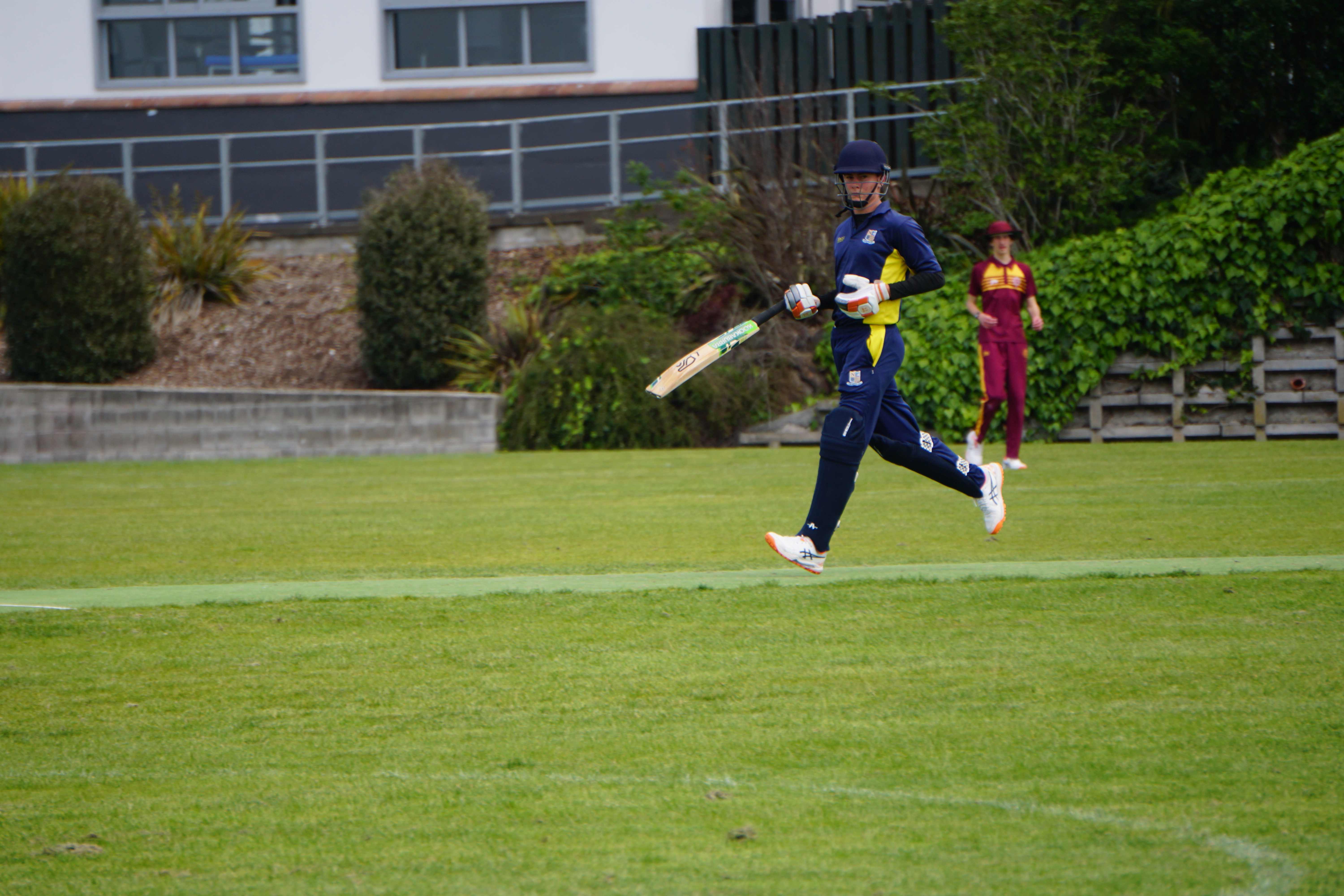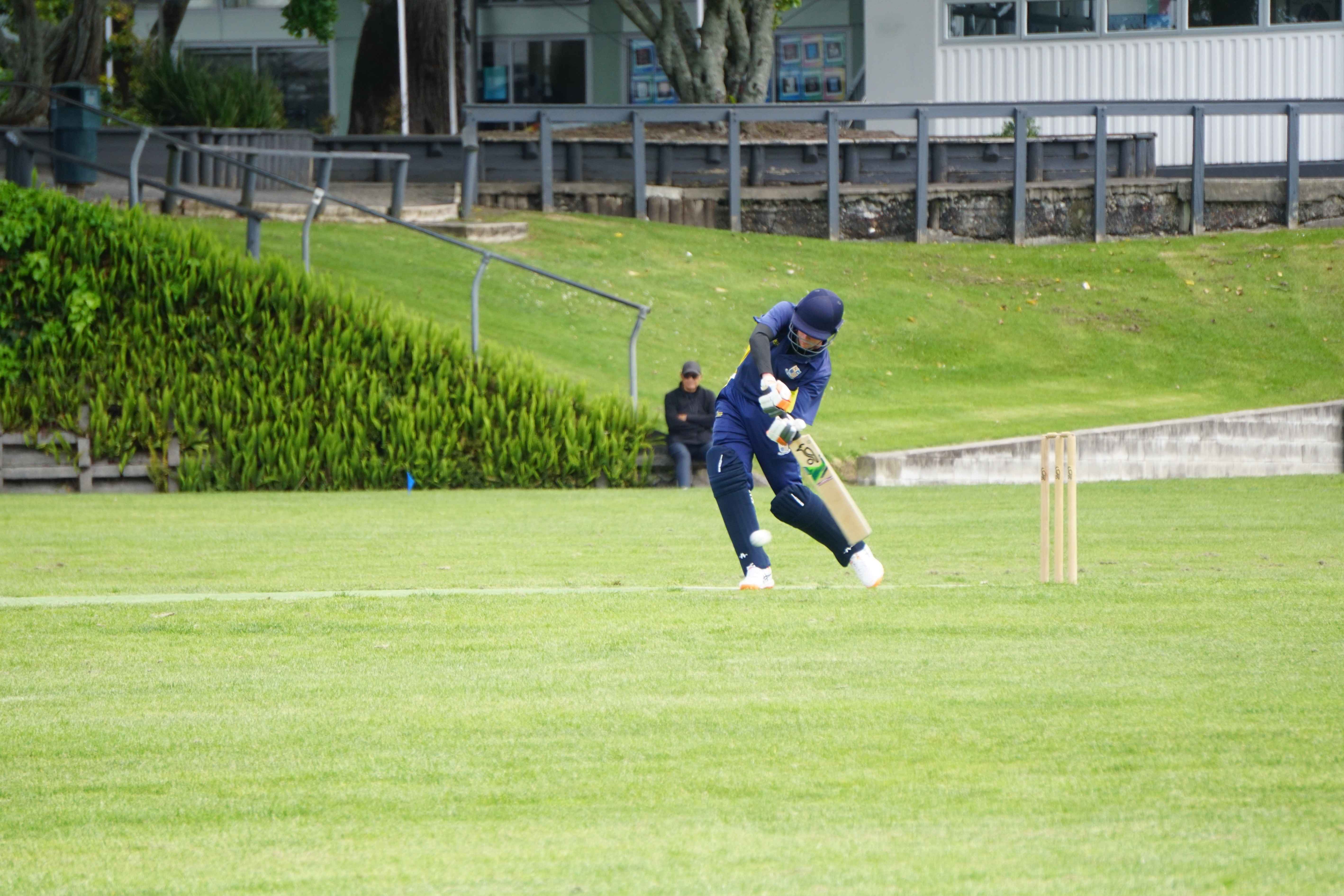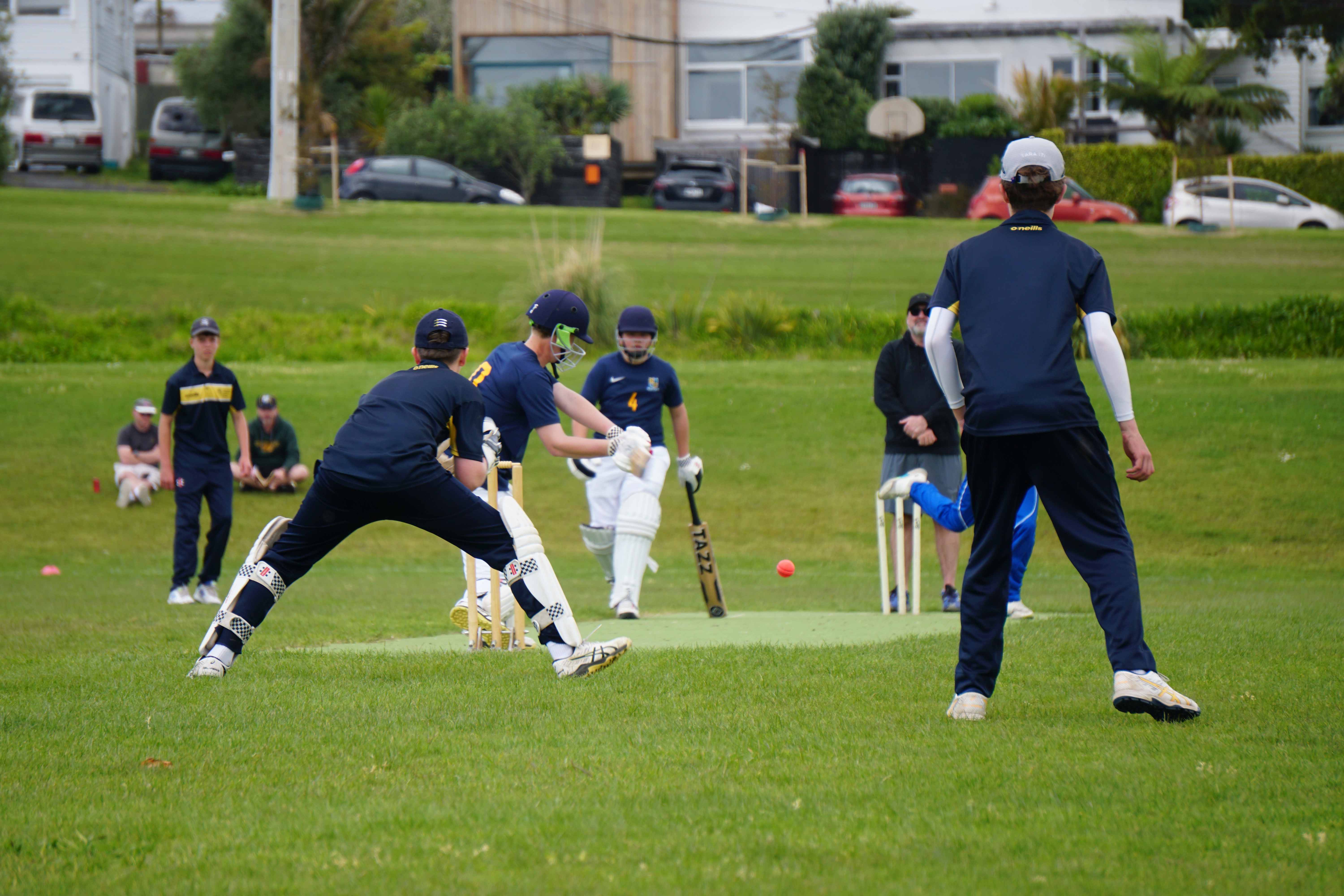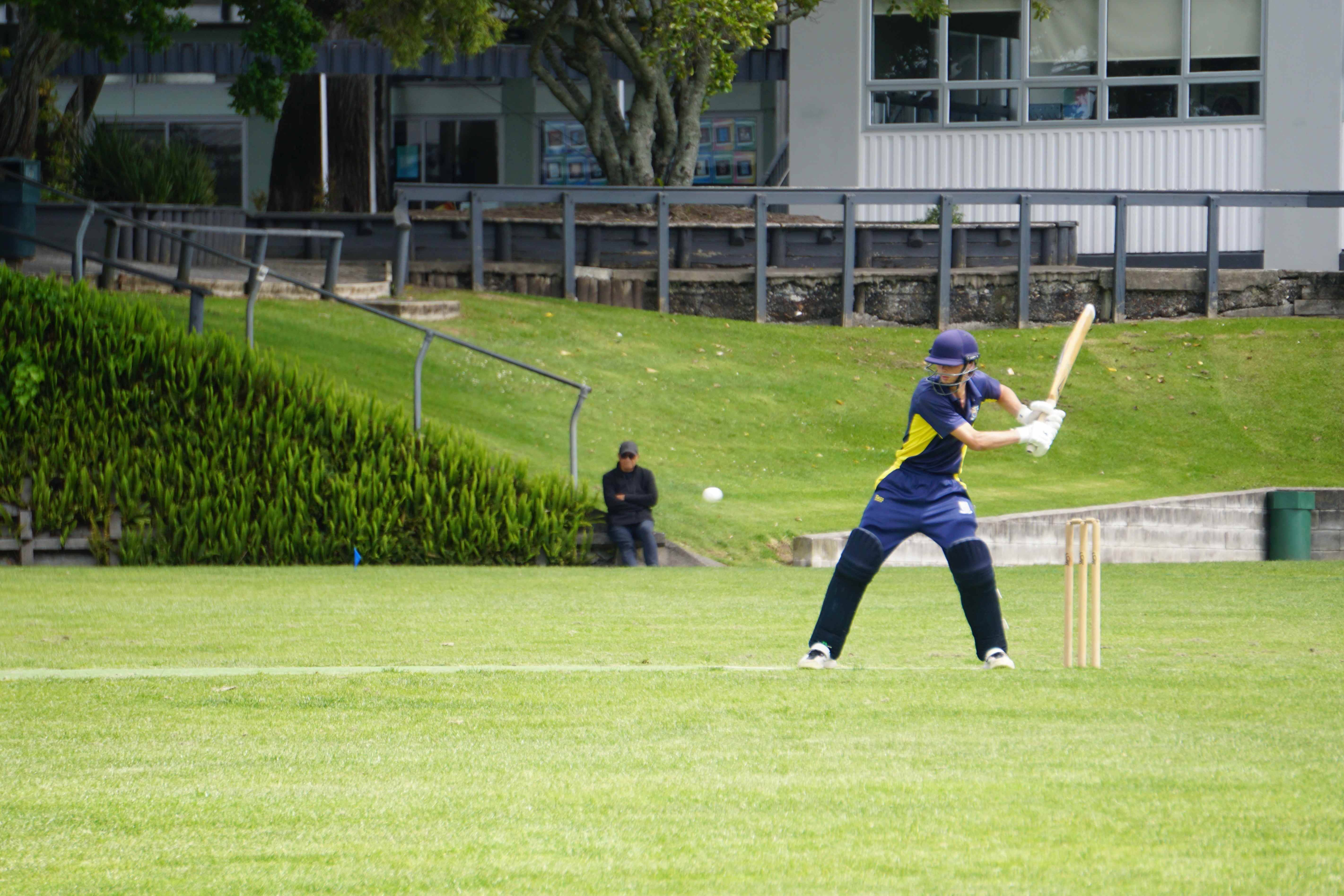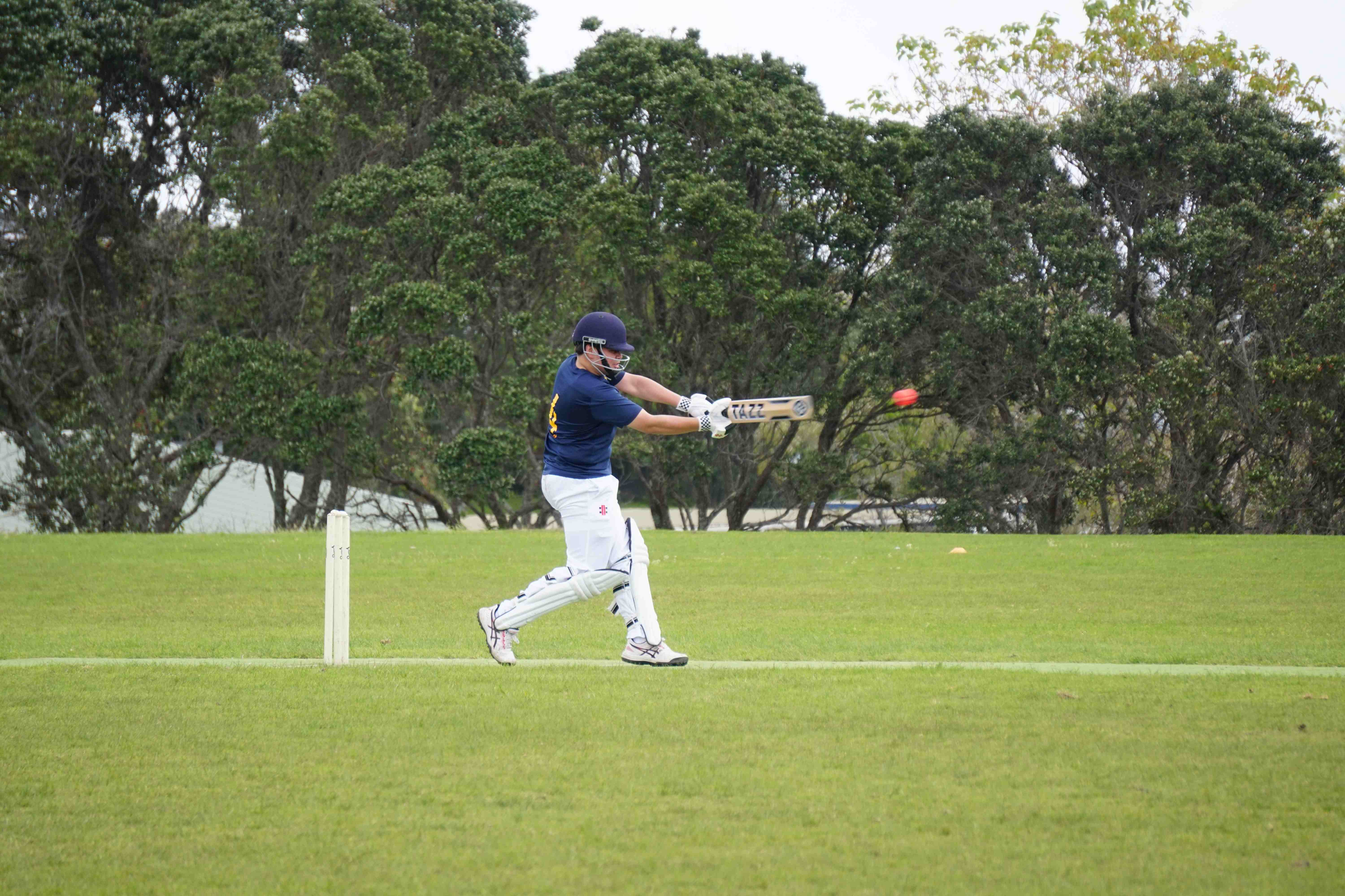 Caelan Scott (9LEE) and Liam Abbot (9MKE) each grabbed an early wicket to threaten an upset, but a superb 112 from the Takapuna Grammar opener scored at a furious rate soon dispelled that idea. Liam Duggan (10KKM) finally dismissed him while bowling very well, taking 1 for 15 off 5 overs.