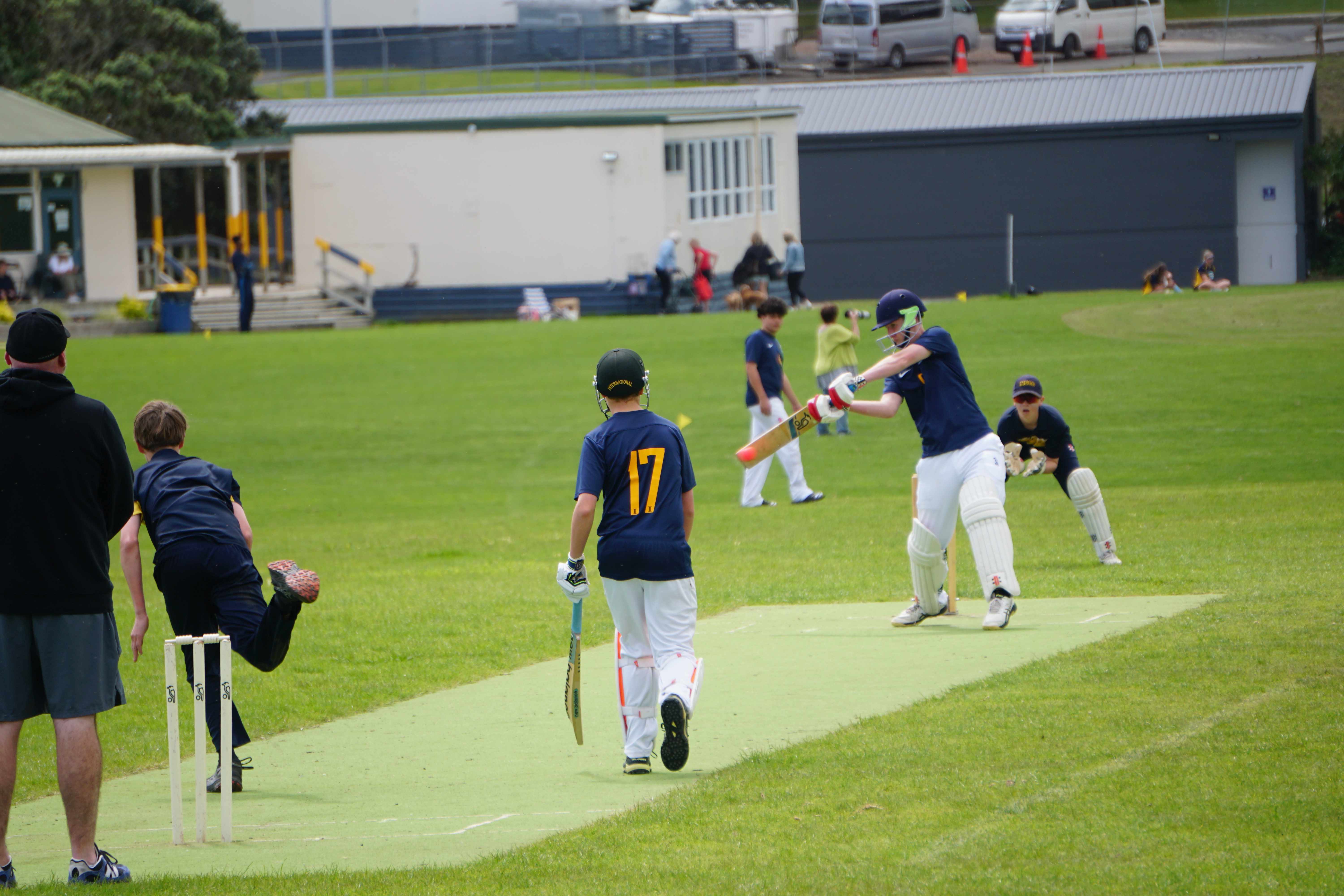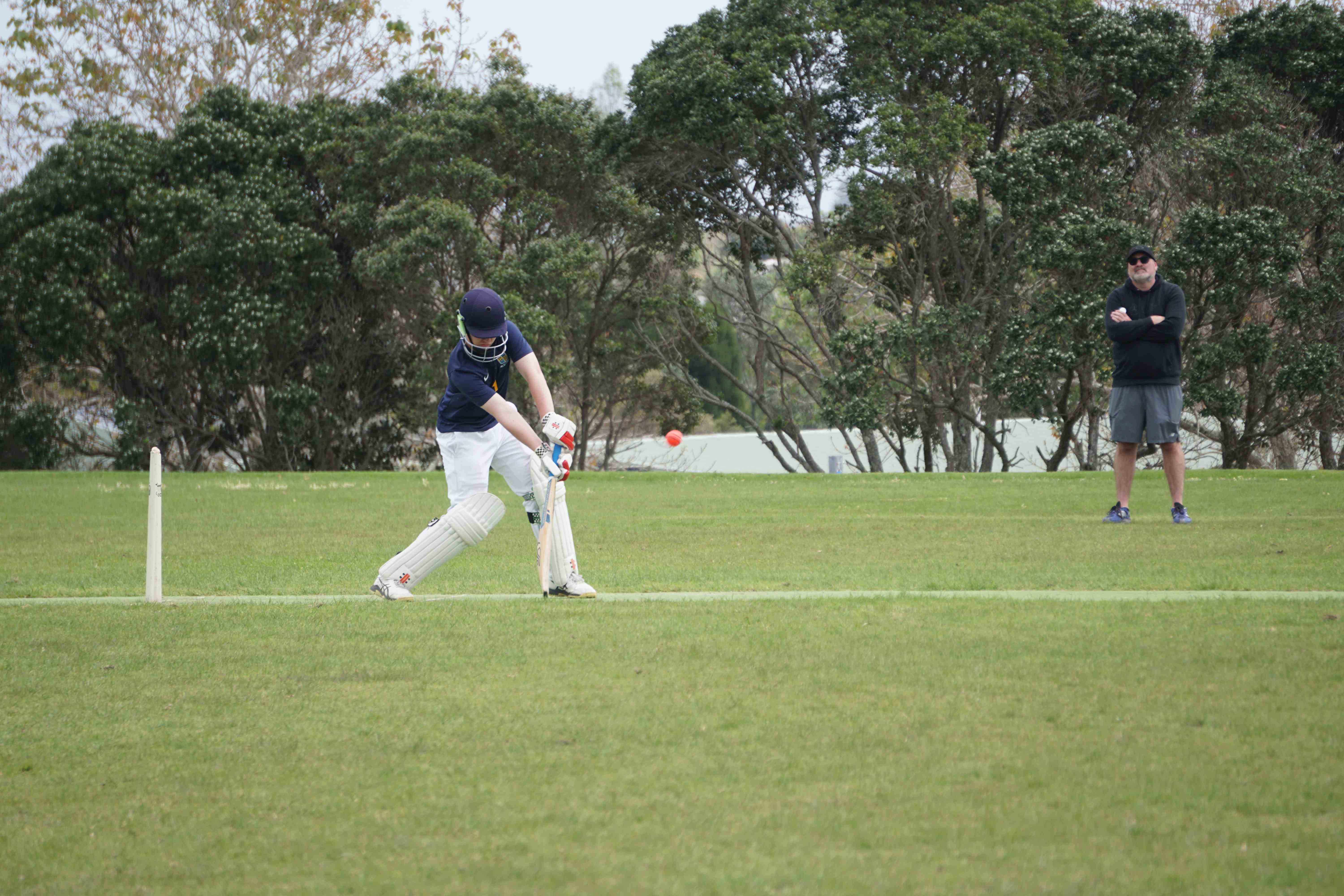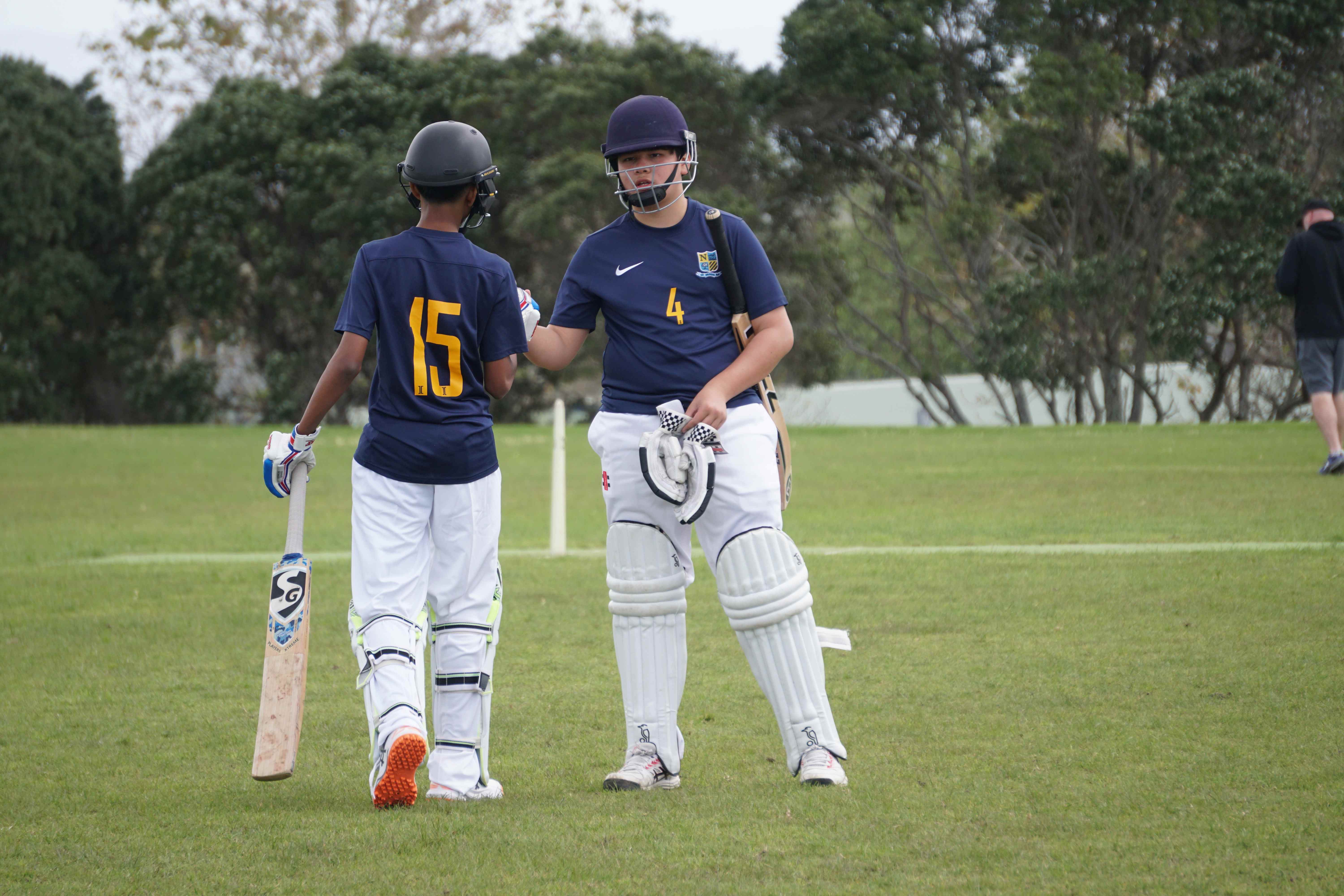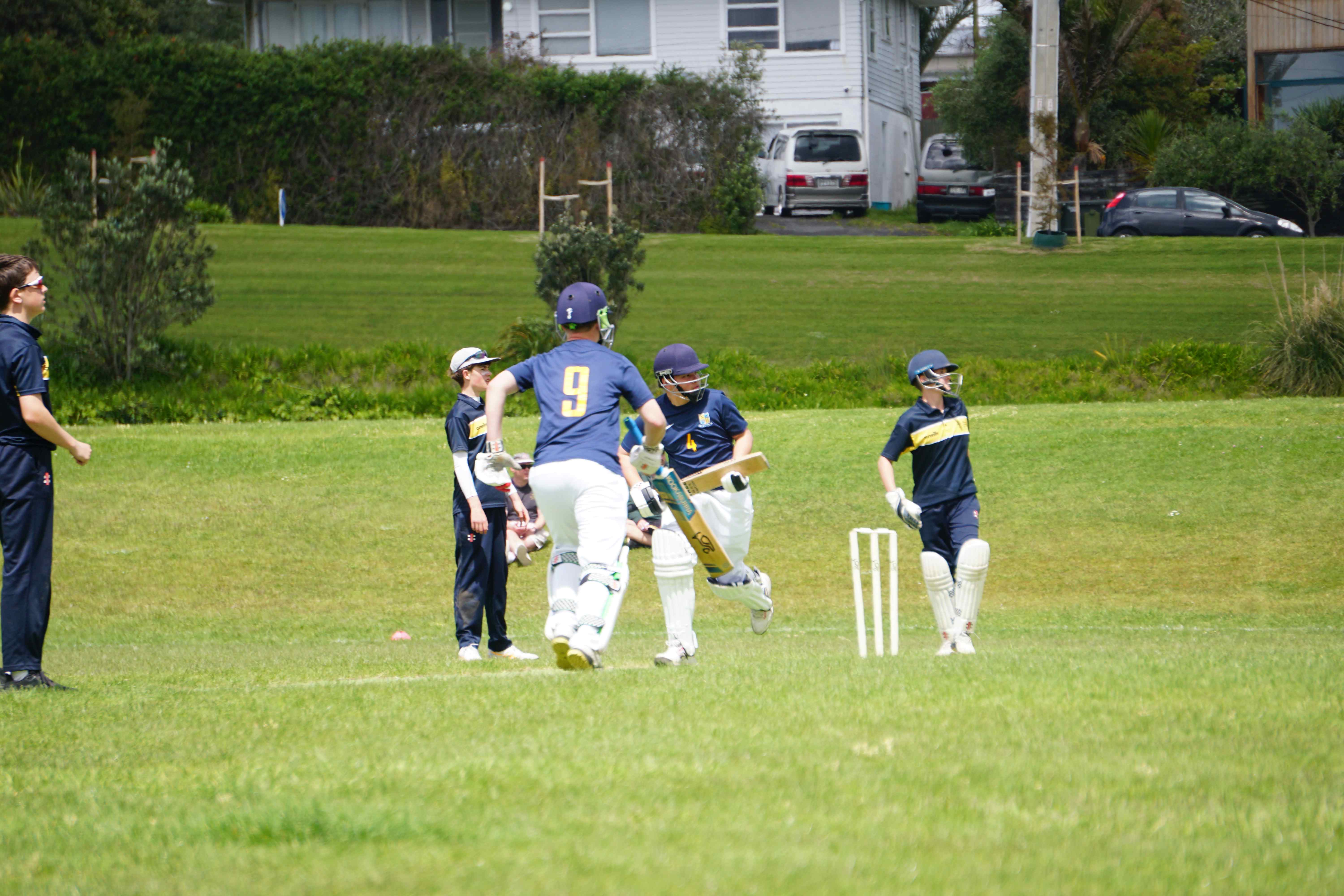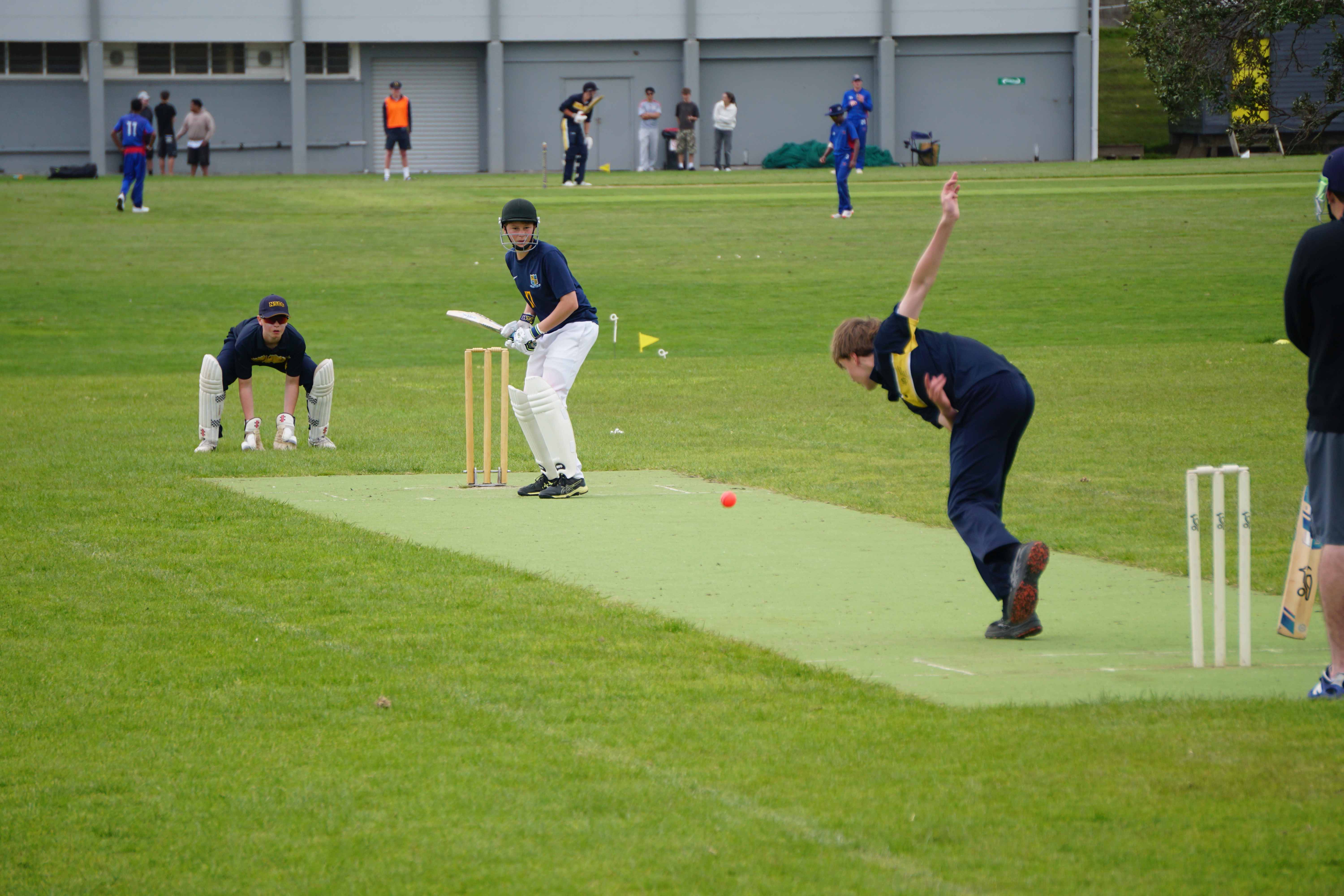 Caelan Scott (9LEE) and Liam Abbot (9MKE) each grabbed an early wicket to threaten an upset, but a superb 112 from the Takapuna Grammar opener scored at a furious rate soon dispelled that idea. Liam Duggan (10KKM) finally dismissed him while bowling very well, taking 1 for 15 off 5 overs.