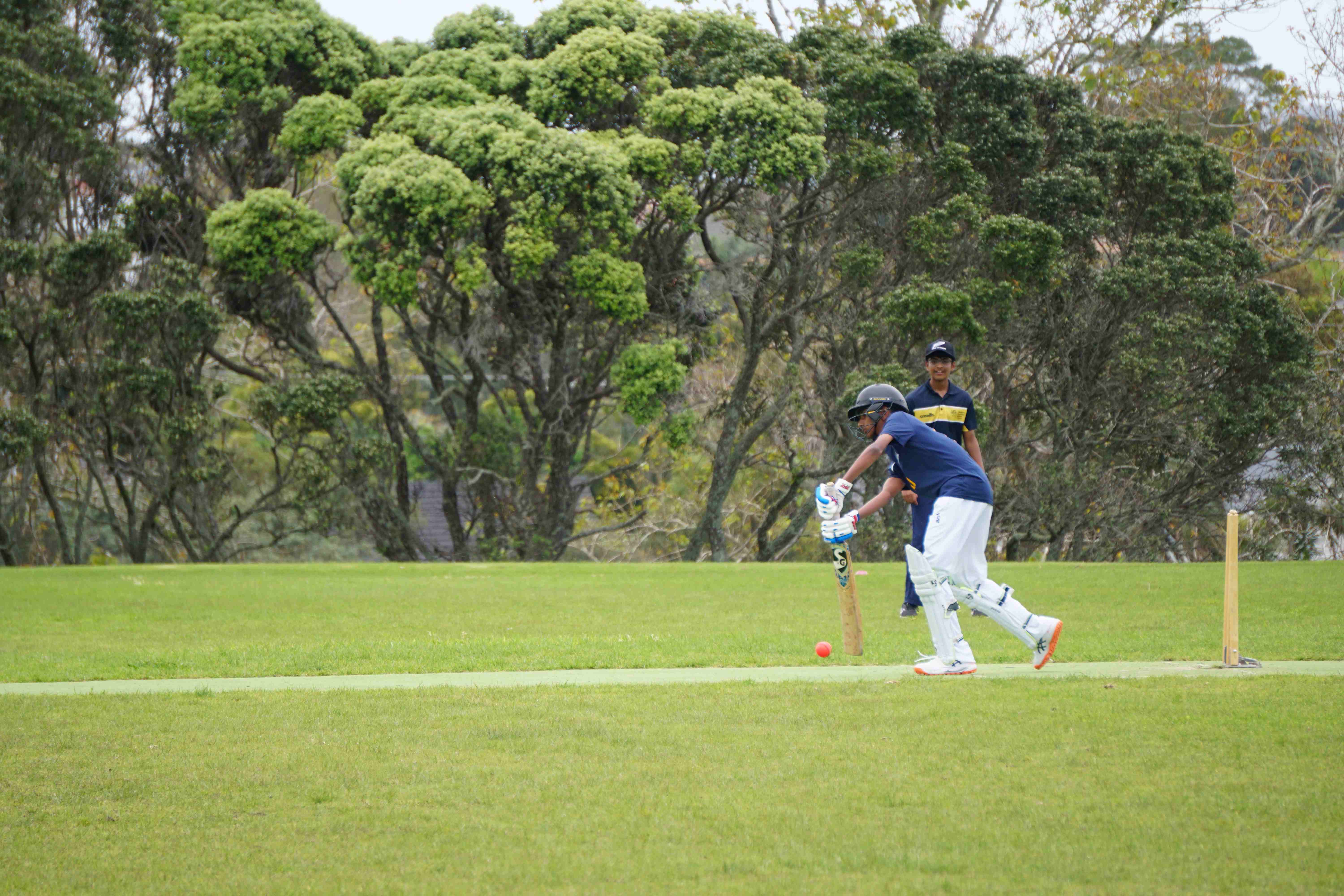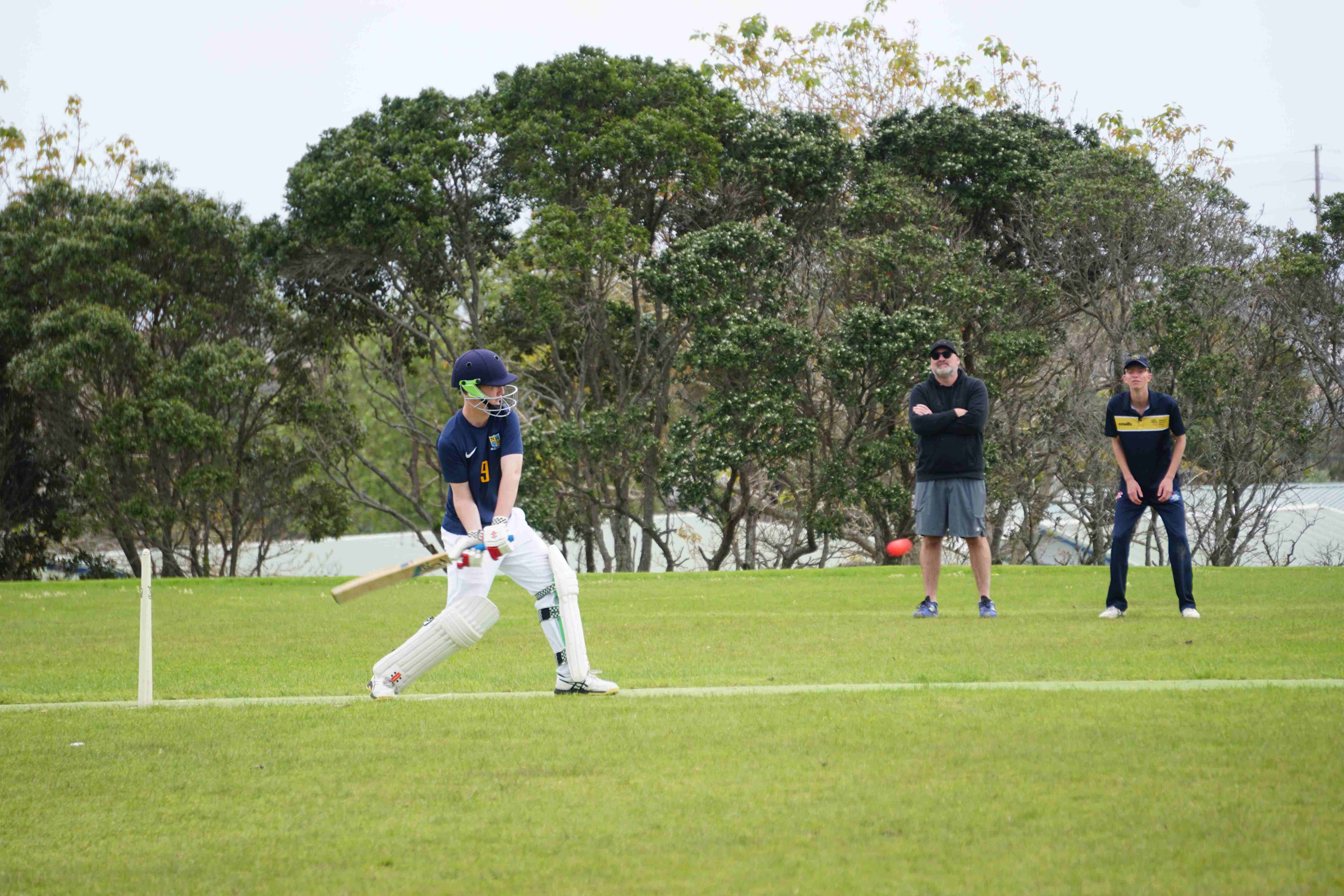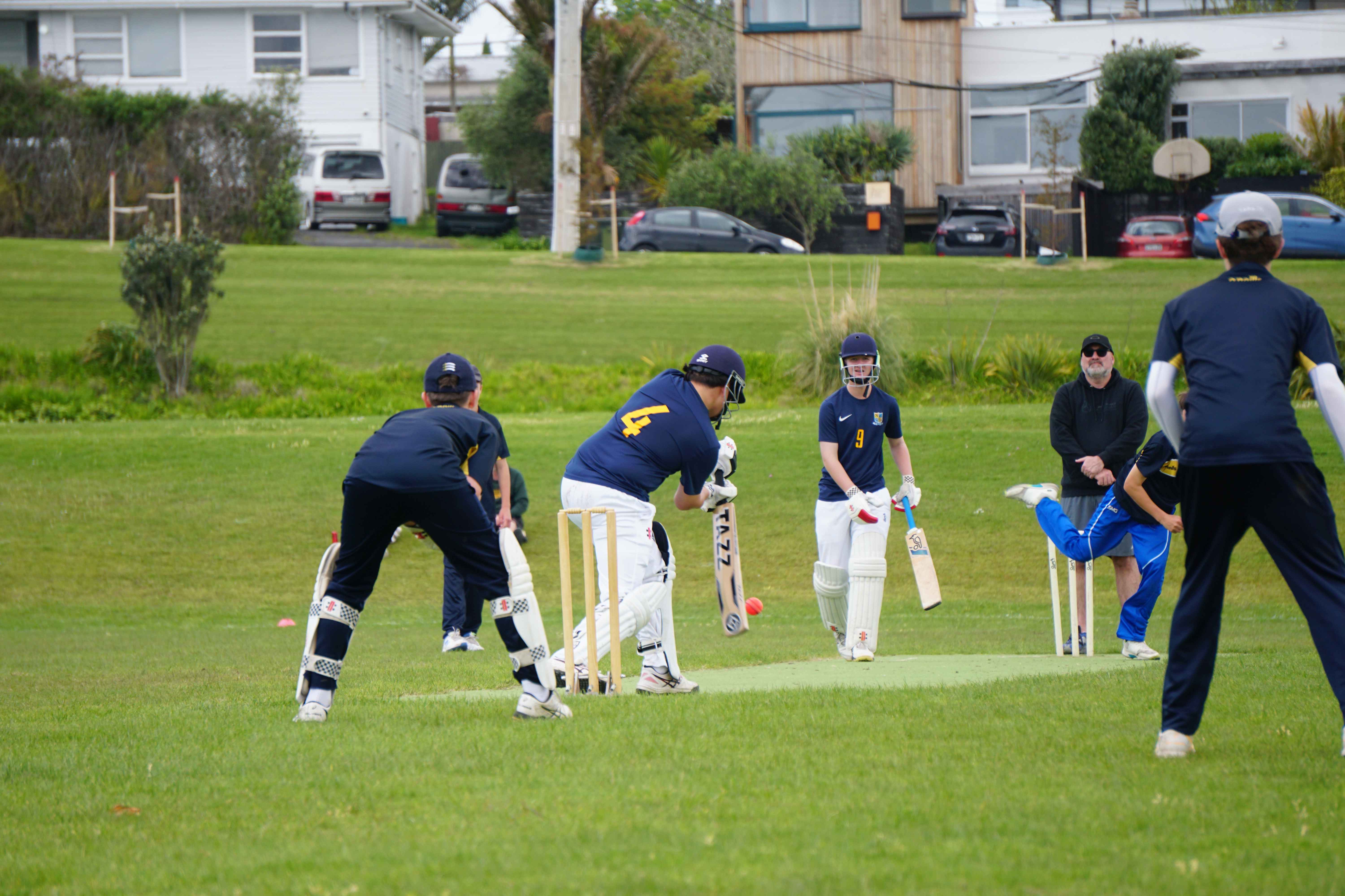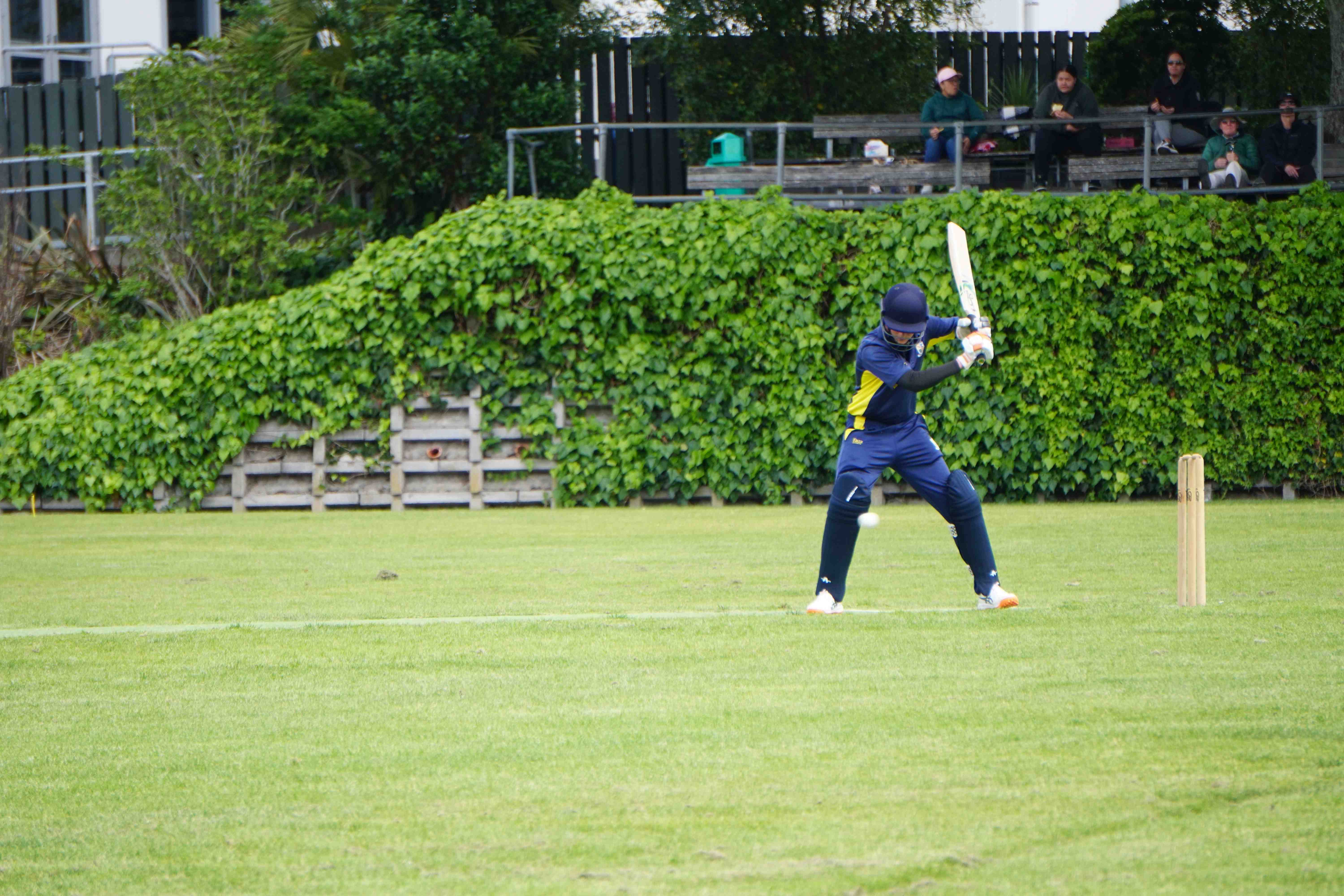 Caelan Scott (9LEE) and Liam Abbot (9MKE) each grabbed an early wicket to threaten an upset, but a superb 112 from the Takapuna Grammar opener scored at a furious rate soon dispelled that idea. Liam Duggan (10KKM) finally dismissed him while bowling very well, taking 1 for 15 off 5 overs.